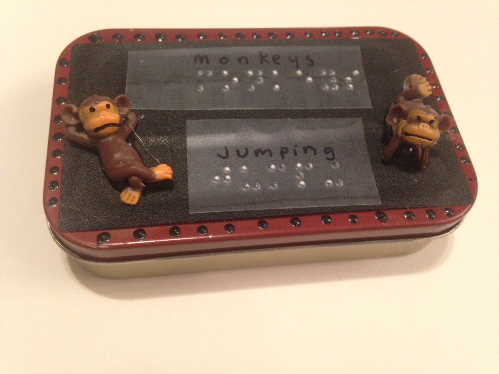 - Braille labels. Create labels of key words that go with the story to attach on the cover and back of the Altoid box. Ex: Monkey, 5, jump, doctor, mom, bed, hit, and head