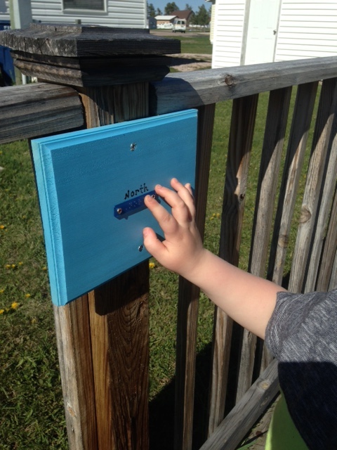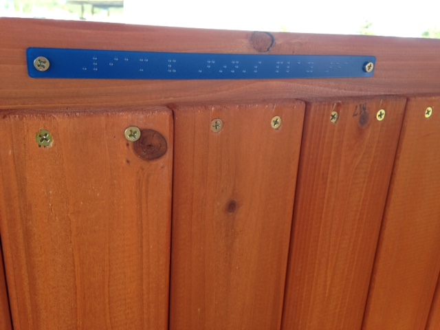 I added newly painted wooden plaques that have labels North, South, East and West written on them in braille. I attached them onto the fence on the 4 cardinal directions.