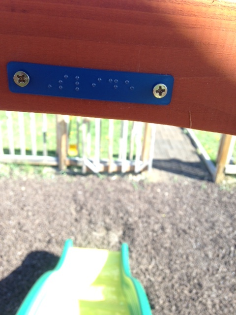 I found a really neat website called Just Braille Signs that worked well with me to create labels in braille on durable plastic labels. I wanted something that would hold up well outside. I labeled things such as: slide, Liam and Finn’s spot on the picnic bench, play house, etc. Liam absolutely loved finding the braille labels and reading them.