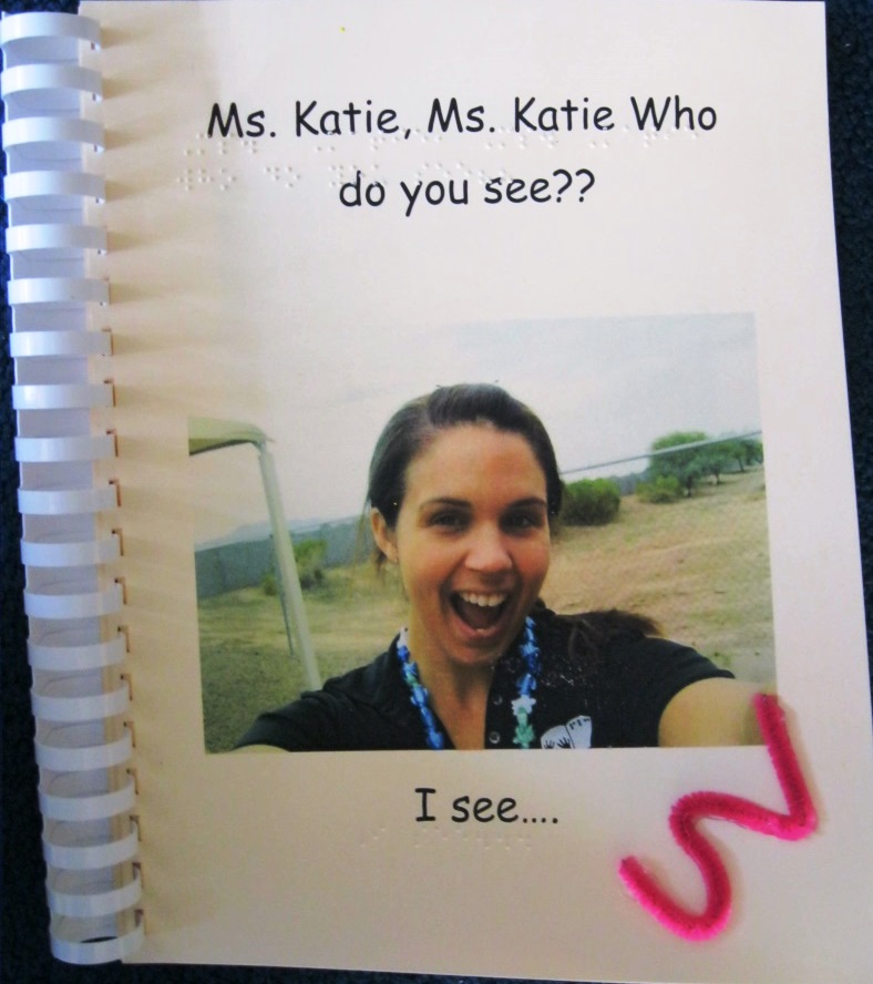 The story goes: Ms. Katie, Ms. Katie, Who do you see? I see _____ looking at me!! The book goes on like that, and ends with “I see all my friends looking at me!” and it has a group picture. The book includes all the students as well as all the regular classroom staff, therapist, the nurse and special area teachers (all the adults have texture symbols too).