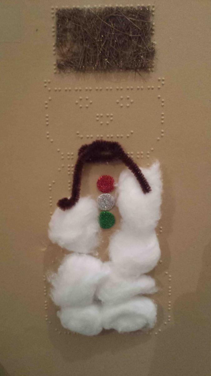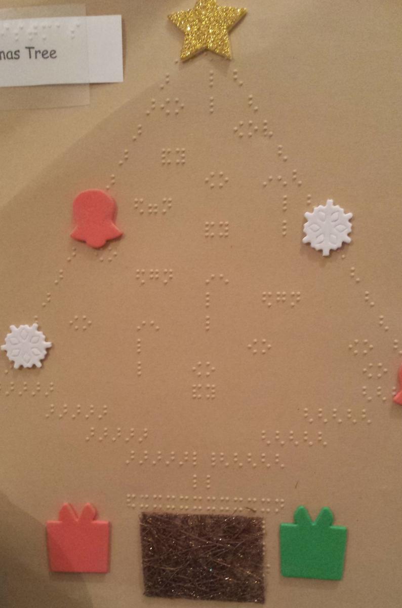 These two pictures are made from “So What about Drawing” by Marie Porter, which you can find online. They are called Braillables. I made these pictures to model what can be done with a Perkins brailler for the two Teaching Assistants I am training in school. It was some festive fun: you can turn the pictures into cards or just use as displays around the classroom. There are much easier patterns for students to make and the “for” sign is very popular with the young students for making trees. You can then decorate them as you wish. It’s lovely artwork for school and allows students to get use to maps and charts in a fun way. Knowledge of braille letters and contractions is necessary.