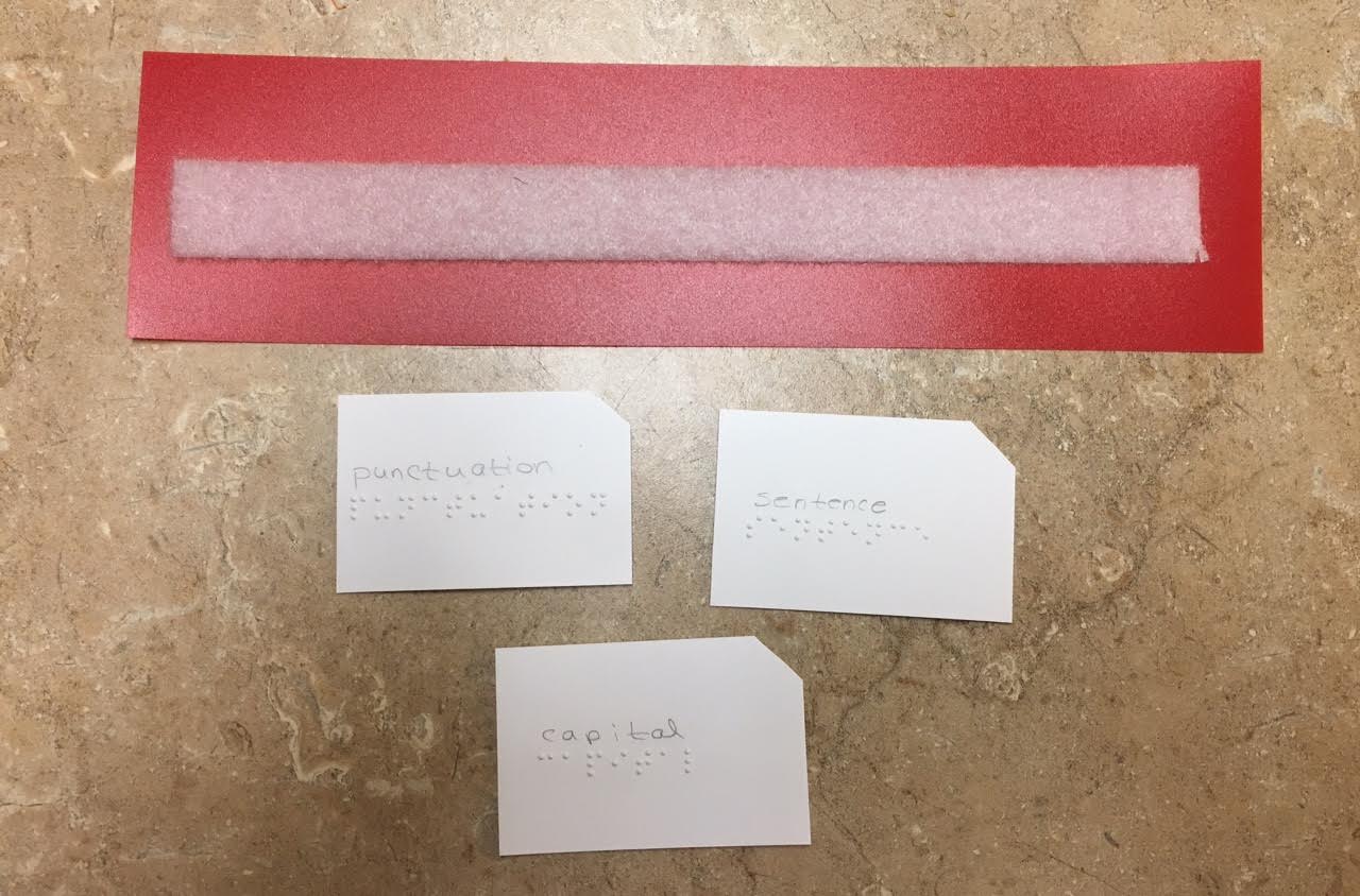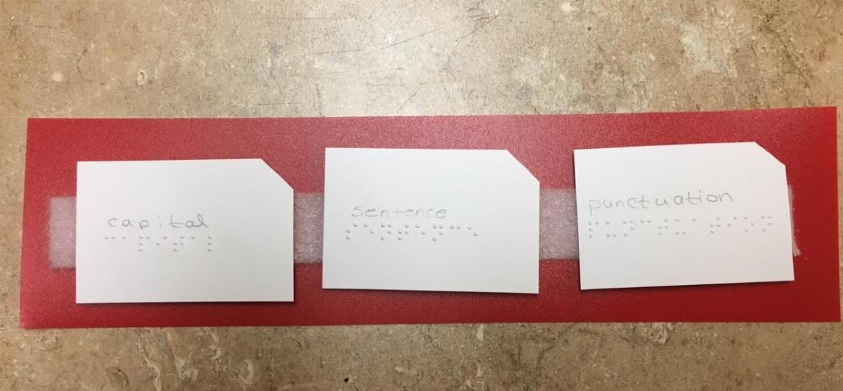 To help him remember the order of the elements of a sentence, I’ve made a reminder strip for him to review prior to his brailling of sentences. There is a horizontal velcro strip and three cards with the words “punctuation”, “capital”, and “sentence” brailled on them.