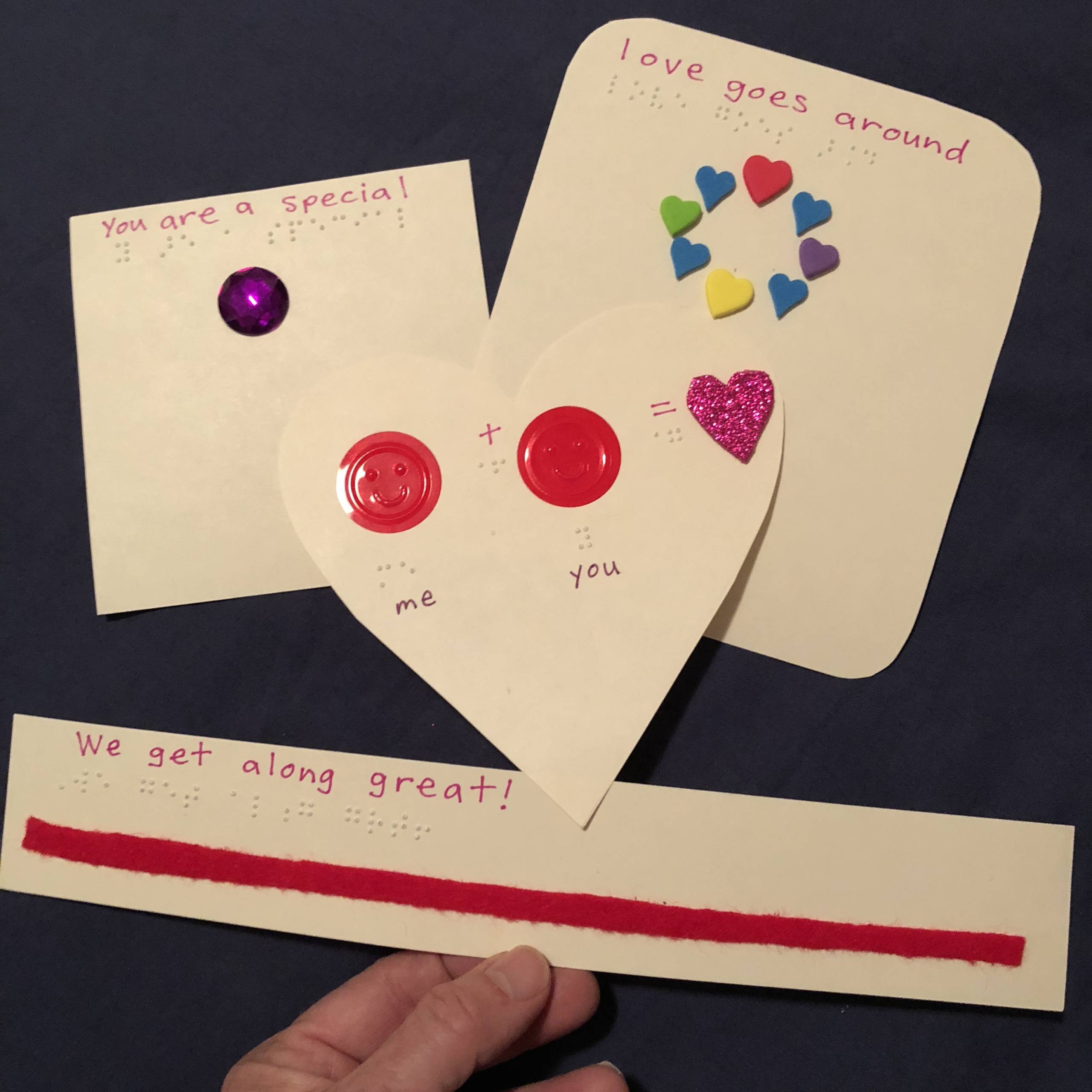 Help classmates use brailler to braille their name on label paper and after a sheet is filled up with names, an adult can cut out the braille names. Students can pick a pre-made valentine and stick on their brailled name and possibly decorate Valentine further.