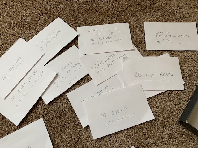 I am the mother of two boys: Liam, Deafblind, age 10, and Finn, typical vision and hearing, age 7. We are starting week five of work/school at home, due to the Covid-19 pandemic. I created these exercise cards for the days we are not able to get outside because of weather. The boys take turns picking a card and we all do the exercise on the card together. They love them! We have been adding more cards as we go along too.