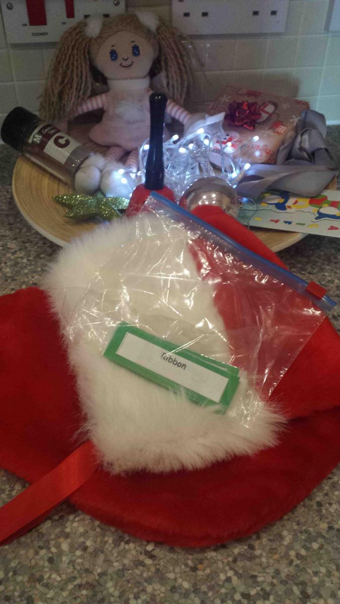- Firstly gather your objects together and put into a Christmas Stocking or Basket. I would suggest using a variety of sensory objects, e.g. a noisy object, a spice (cinnamon, nutmeg, ginger), something rough, soft, prickly, woolly, etc.