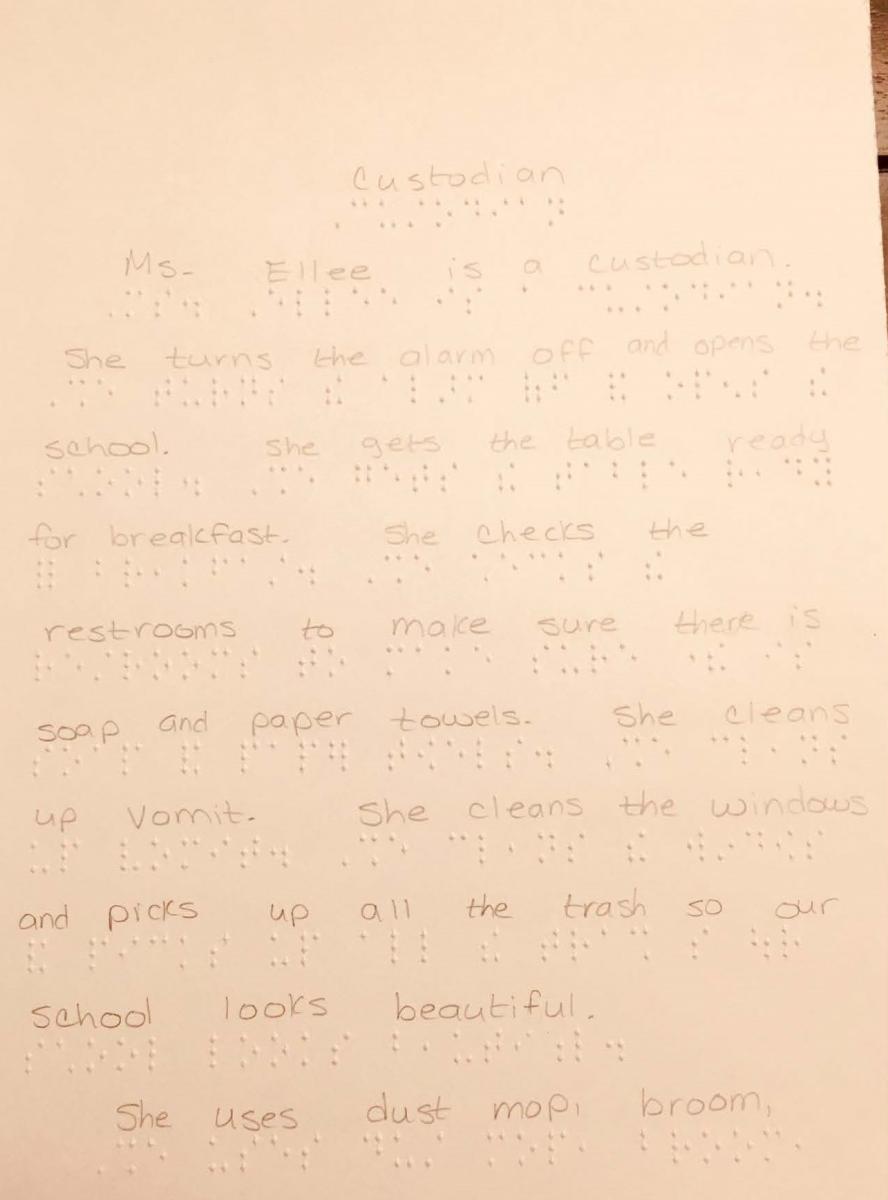 My third grade student has been having difficulty with his writing. He can braille anything told to him, but struggles with original compositions. I decided to pull in the Expanded Core Curriculum (ECC) and the AMAZING poster that APH has and do a little career education. This student loves to ask “what is” questions. I decided to let him investigate the answers on his own!