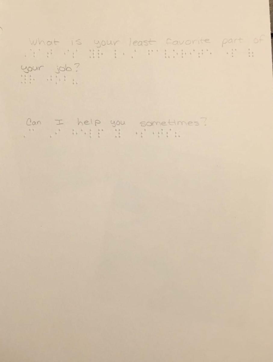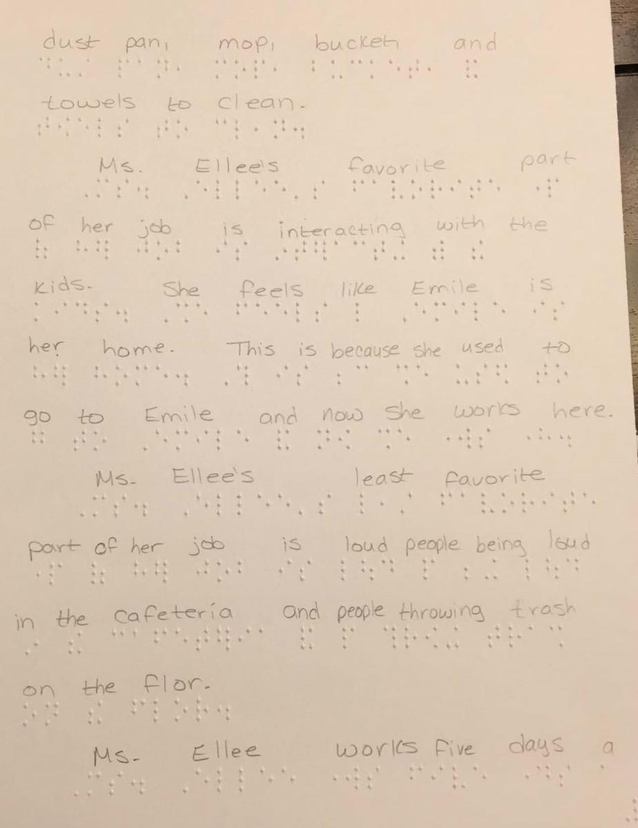 He knew he wanted to interview Ms. Ellee because she’s a custodian he encounters on a daily basis. With the speech therapist’s assistance, he developed a list of questions.