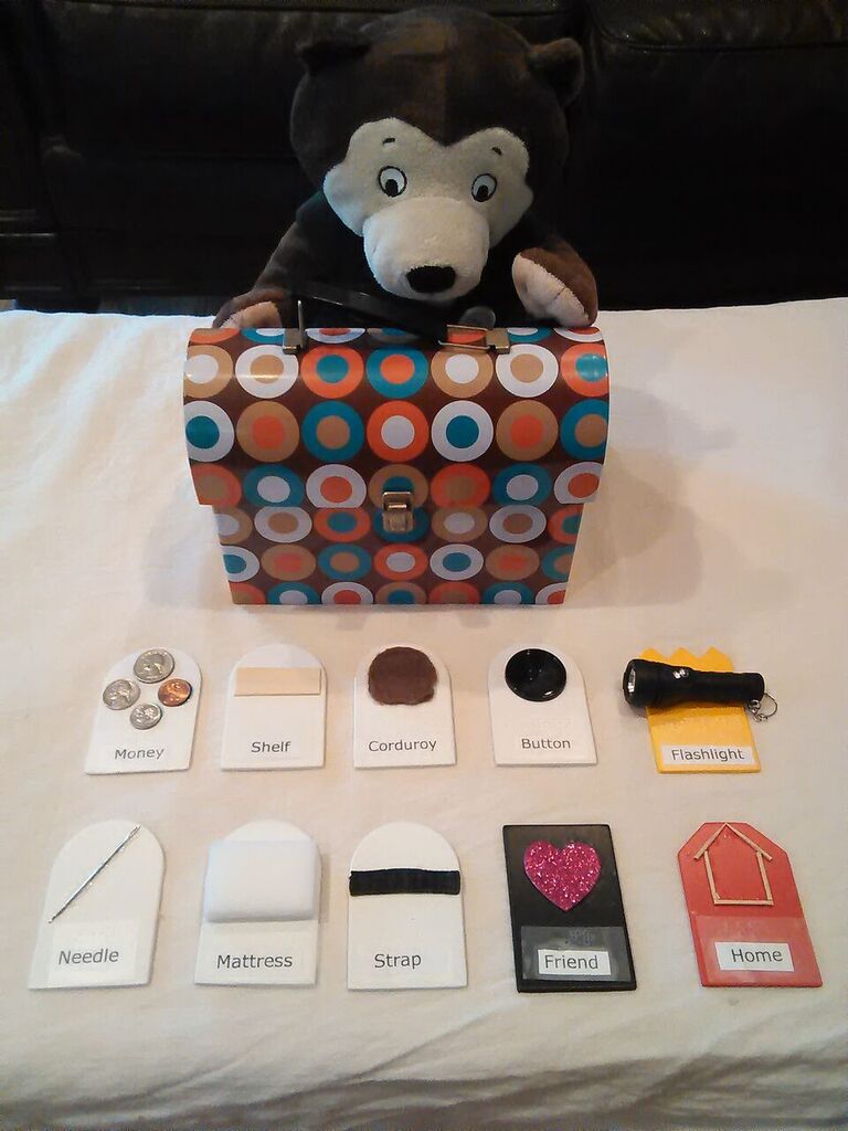 - To continue with the theme of the Corduroy story, the cards are stored in a lunch box that has a bear wearing corduroy overalls attached to the outside.