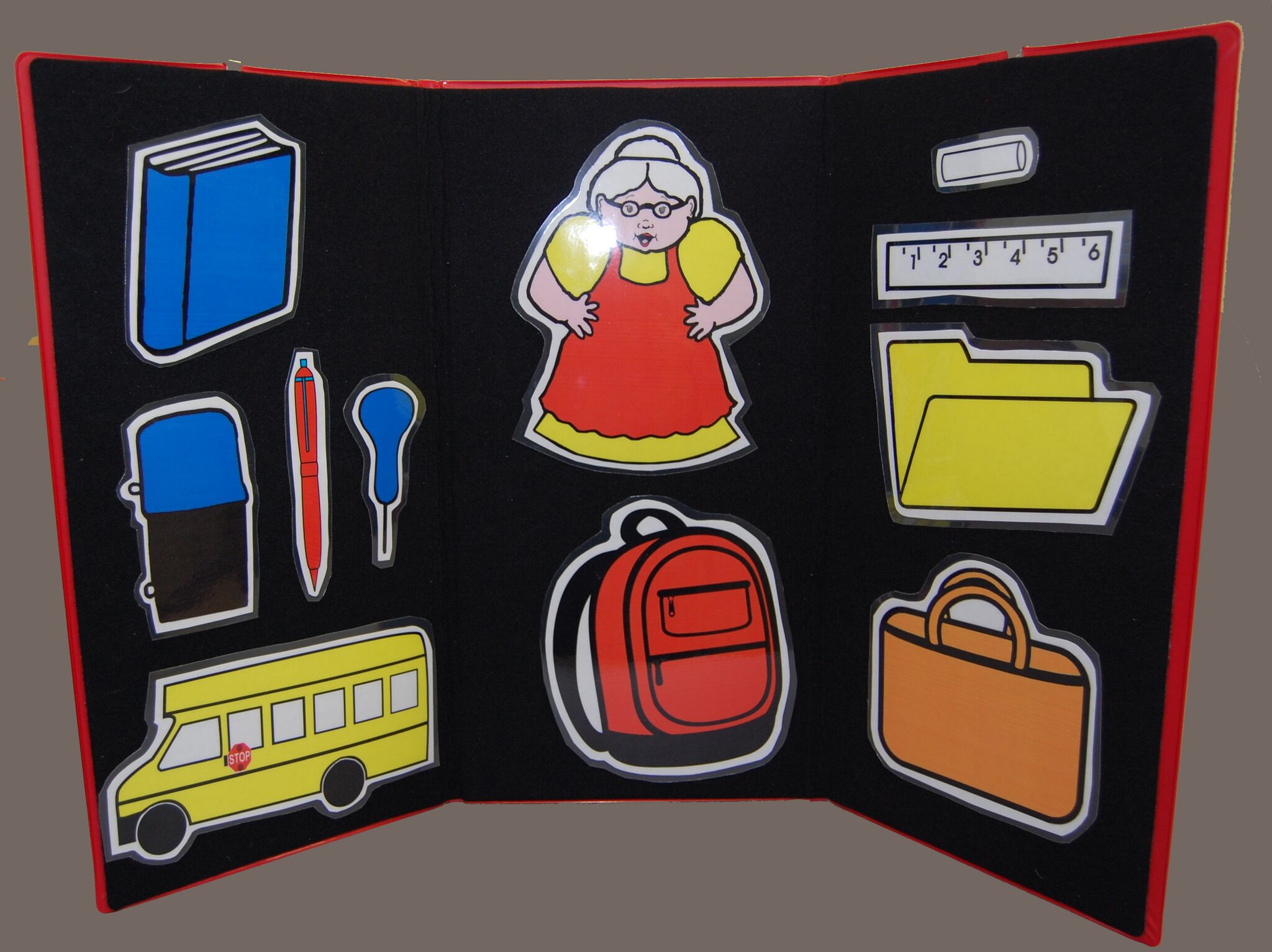 We would discuss the concept of “inside,” while seeing that the pen goes inside the pencil case, the ruler goes inside the folder, the chalk goes inside the bag, and that everything besides the school bus goes inside the backpack. I would let the child practice placing items inside one another to reinforce the concept and help with manual dexterity (and hopefully for fun). I would ask who goes inside the school bus so that the child could say “me!”