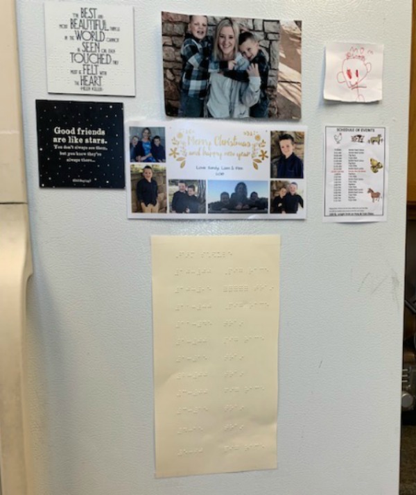 I brailled a copy for him and we have the schedule on the fridge as well. This means that all of the members of the family have equal access to the schedule and can plan accordingly.