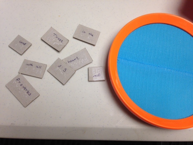 This idea was inspired by an activity that Liam’s TVI and team have done on many occasions with Liam at his school. His team would add braille to small rectangle cardboard pieces and attach Velcro to the backs of the words. Liam then could use the velcro pieces to sort words by patterns like his peers (he attends a mainstream second grade classroom) or he could create sentences with his pieces. Liam loves these cardboard pieces. Using this same idea for church, I added braille words (from his verses) to rectangle pieces so that Liam could use them to “build” his Bible verse.