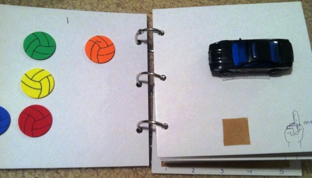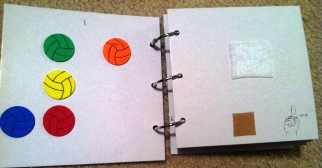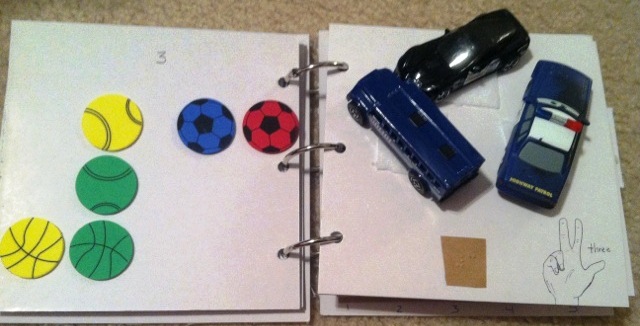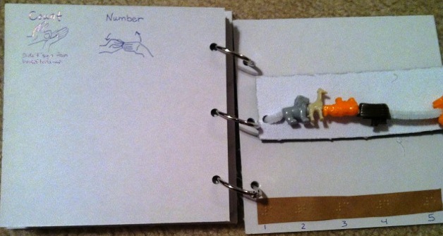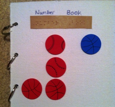 Create a counting book with objects that can be removed, via Velcro, for the child to count and then place it back on the book. The bonus about having removable objects is that you can change the object being counted to cater to the interest of the child. You will also notice each page has the ASL sign for the number as well as the braille number.