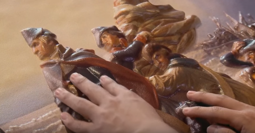 In addition to the tactile feedback received through touching three-dimensional artwork, sensors are embedded throughout the prints that when touched, activate custom audio that describes what is taking place at that exact spot in the image.