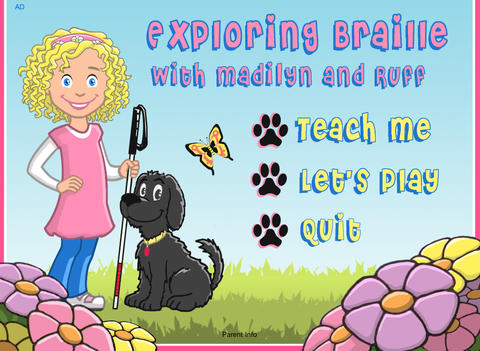 The Exploring Braille with Madilyn and Ruff App was created by the mother and teacher of a child who is blind and is designed to help young children learn the braille alphabet. It is a free app that uses sound and touch in an interactive approach in two different instructional approaches, and has two quiz modes to assess a child’s reading and writing skills in braille. The app is geared toward children from ages 4-10 years, although it can be used by anyone learning braille. It is fully accessible to people with visual impairments, using an external refreshable braille display (RBD) and VoiceOver.