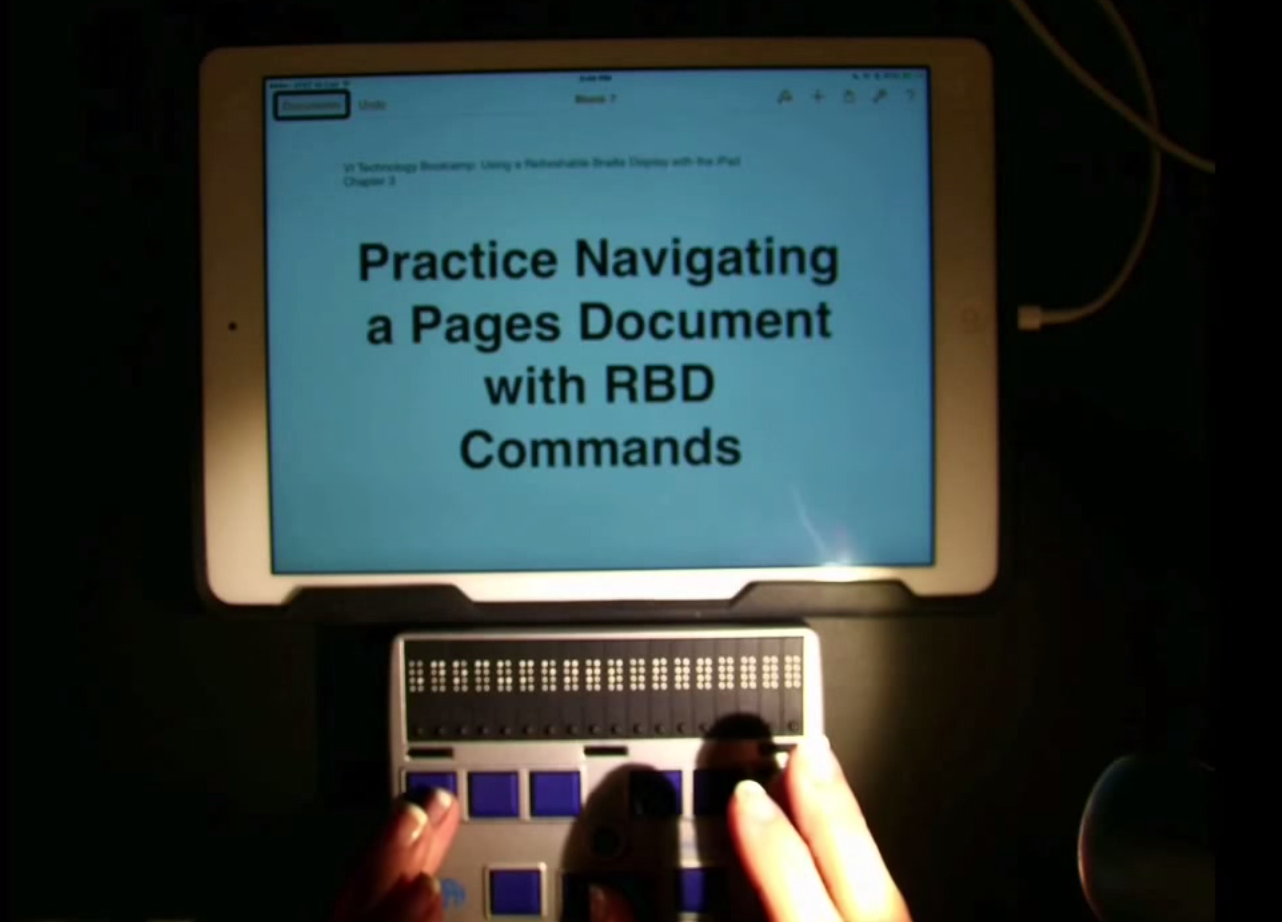 This video from Diane Brauner demonstrates the navigation of the Pages app (iOS 8.1.3) using refreshable braille display (RBD) commands.