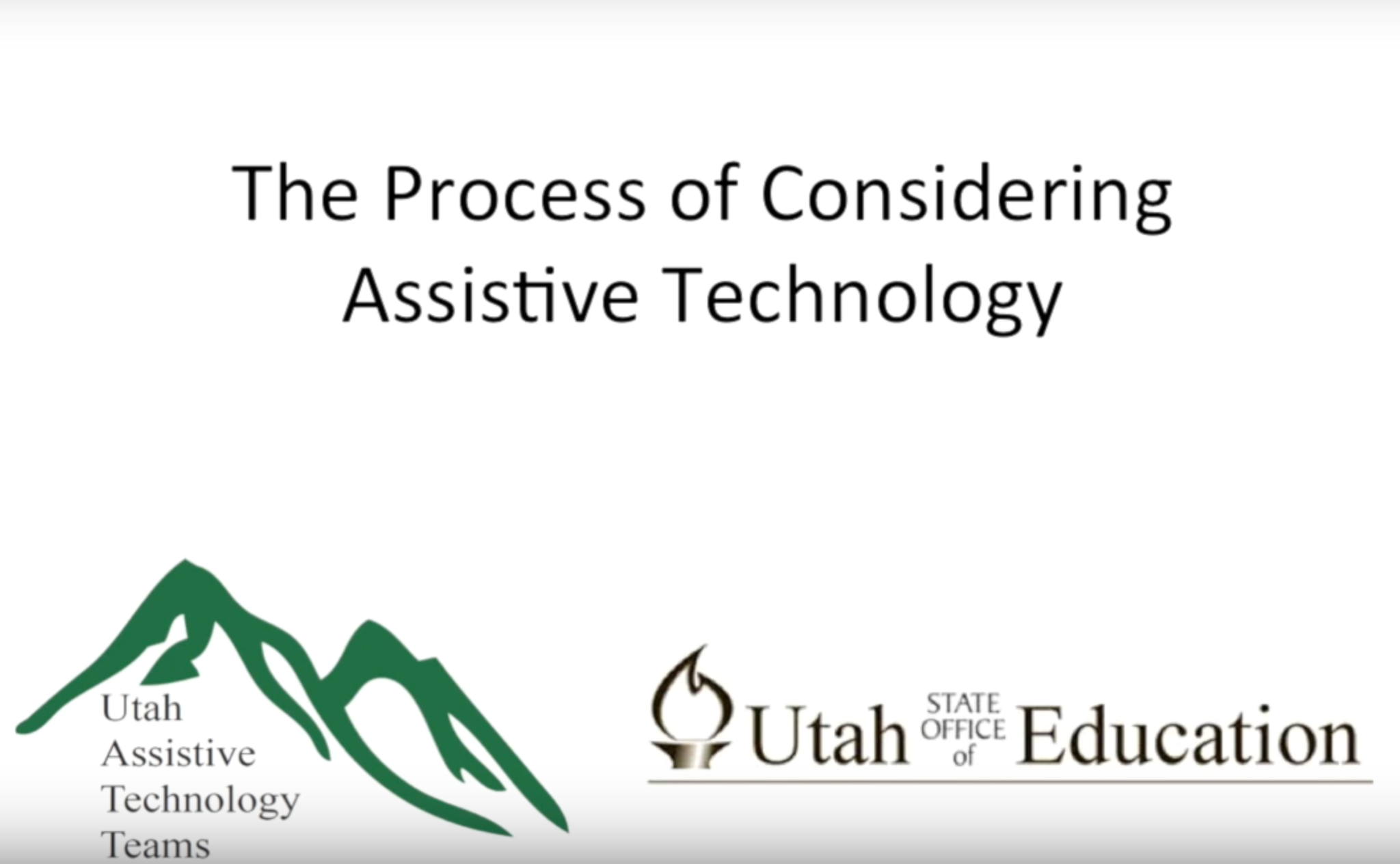 The Process of Considering Assistive Technology (AT) is a 5-minute video produced by the Utah Assistive Technology Teams with a grant from the Utah State Office of Education. It provides an introduction to AT, looking at both AT devices and services. Considerations include the following steps:
