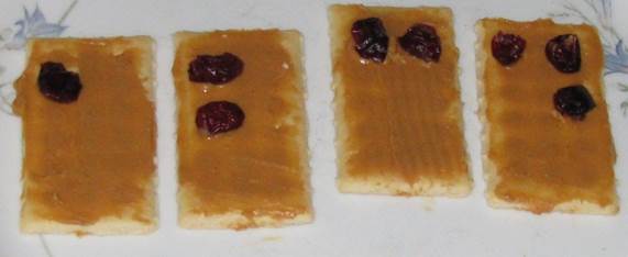 Peanut butter is spread on crackers and raisins are placed in the position of braille dots